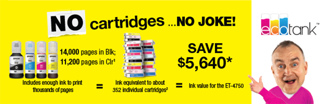 6. Yields based on the ISO/IEC 24712 pattern with Epson's methodology. Actual ink yields will vary considerably for reasons including images printed, print settings, temperature and humidity. Yields may be lower when printing infrequently or predominantly with one ink colour. All ink colour’s’ are used for printing and printer maintenance, and all colour’s must be available for printing. Click here for details on ISO testing. (PDF)