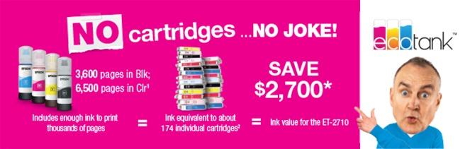 For one upfront price, the Epson EcoTank ET-2710 printer comes with enough ink in the box to print for up to 2 years1, so you can print 3,600 pages in black2 / 6,500 pages in colour2 without worrying about ongoing ink replacement and costs.