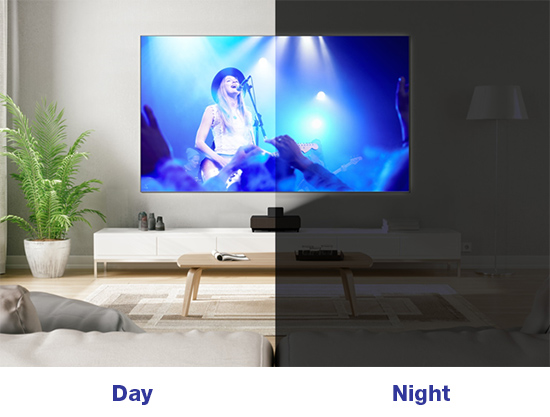 Combine Epson laser projection TV† with an ultra high-definition ambient light rejecting screen to produce vivid colours and deep blacks in virtually any viewing environment. Become fully immersed in the entertainment with exceptionally bright, sharp and colourful content at any time, day or night.