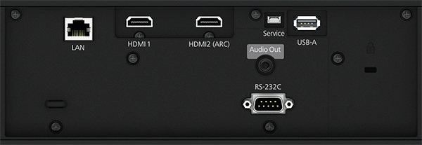 | Input: Video | 1 x USB A, 1 x RS-232 control, 1 x RJ45, 1 x USB B mini (service) | ||