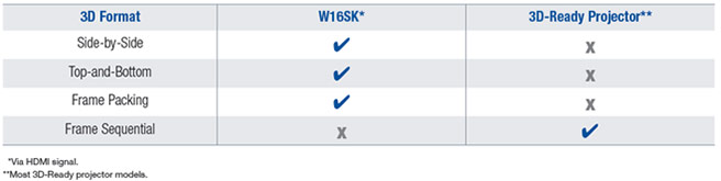 The EB-W16SK supports multiple 3D formats, eliminating the need for an external converter box. However, most 3D-ready projectors only support one format, and an external converter box must be purchased in order to support multiple formats. So, when you are evaluating the right 3D projector, make sure to check to see if the projector supports your preferred multiple 3D formats.