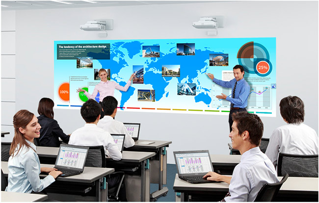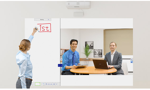 Install two MeetingMate projectors side by side and enjoy the benefits of a huge wall-size area to use as an extended whiteboard. Or, use the included Epson Interactive Tools (EIT) software4 to achieve a giant display on which you can create content or annotate content from your PC or a browser.