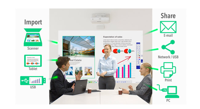 - Capture, Save and Share – no need to transcribe meeting notes or snap a photo; easily save, print or email directly from your projector