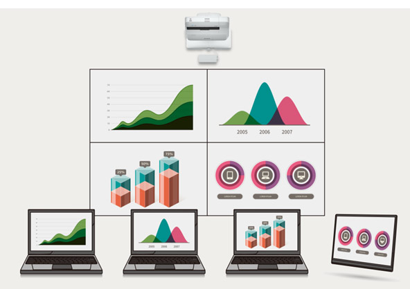 Epson's Multi-PC utility with Moderator device management software5 allows you to simultaneously display up to four devices on the screen over network (wired or wireless), with even more users connected to the same interactive display on Standby Mode. The moderator can drag and drop participants into or out of the four quadrants and control which device screens to display.