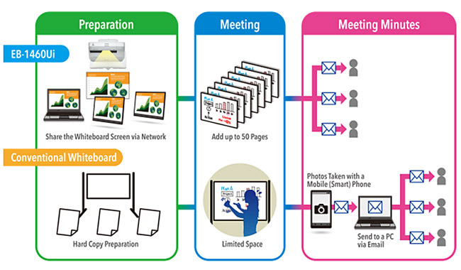 Whiteboard mode allows you to output the meeting results on-site in the user's preferred format. Time to perform tasks such as saving meeting data to PDF (on USB memory, Network), sending email, printing, and making meeting minutes has been shortened considerably. You can also reuse and edit data again from a previous whiteboard session that was saved to a USB memory or server.