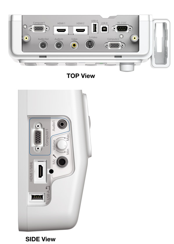 The various input/output connections available include: two HDMI with one MHL connection, two VGA (computer 1 and 2) connectors with corresponding Audio (inputs/outputs), S-Video with Audio (inputs/outputs), AUX Audio (for use with devices such as an iPod), USB Type A, USB Type B, and Record Out. The ELP-CB02 also allows the selection of audio mute and volume adjustment for the optional Epson ELP-SP02 speakers. The ELP-CB02 also includes a handy attachment that allows users to store their iPod or Epson Interactive Pen on the side of the box.