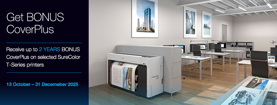 Purchase a new eligible Epson large format technical printer or printer with CoverPlus from an authorised reseller in Australia between:- 13 October 2025 and 31 December 2025 and receive BONUS CoverPlus, up to FIVE YEARS total cover!