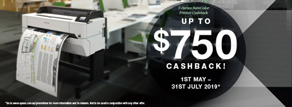 Purchase a new Epson SureColor T3460 or T5460 Printer between 1 May 2019 and 31 July 2019 from authorised Australian Epson resellers and claim up to $750 cashback.
