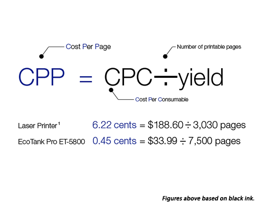 Epson EcoTank Pro printers offer exceptional cost per page value when compared with laser printers due to the extremely low cost of replacement ink and extremely high yield.