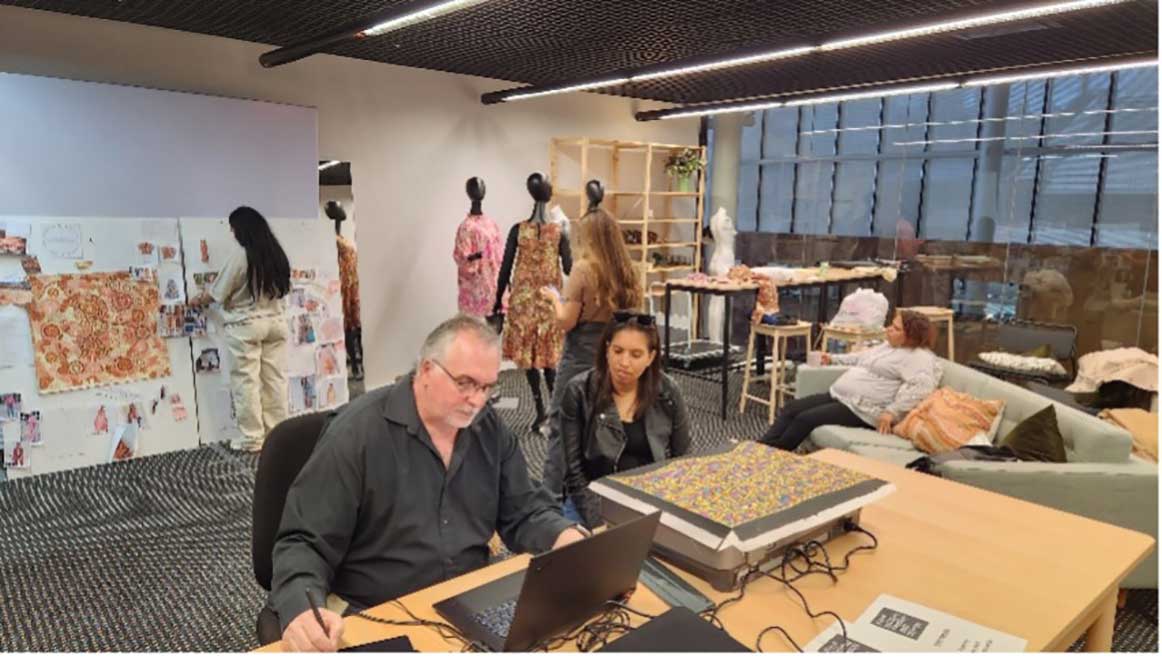 Epson's applications and training specialist Derek Mobbs working with The Incubator program participants to help digitise and print their designs