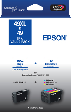 Pack contains: 49XL Black ink cartridge + 3 x 49 Std colours ink cartridges - Cyan, Magenta, Yellow.