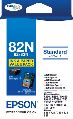 Pack contains: 6 x 82N standard Capacity Claria Individual ink cartridges (Black, Cyan, Magenta, Yellow, Light Cyan, Light Magenta) and a pack of 4" x 6" Photo Paper Glossy - 20 sheets (200gsm).
