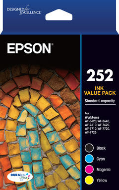 Exclusive to Epson, DURABrite Ultra ink is a 4 colour pigment based ink technology that delivers brilliant, ultra sharp detail on plain and specialty papers. These fast drying inks deliver durable prints that are water, fade and smudge resistant and highlighter friendly too.Pack contains: 4 x 252 Std Capacity DURABrite Ultra Individual ink cartridges (Black, Cyan, Magenta, Yellow).