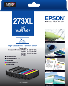 Pack contains: 6 x 273XL High Capacity Claria Premium ink cartridges (2 x Black, Photo Black, Cyan, Magenta, Yellow).