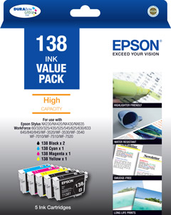 Pack contains: 5 x 138 High Capacity DURABrite Ultra Individual ink cartridges (2 x Black, Cyan, Magenta, Yellow).