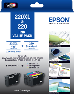 Exclusive to Epson, DURABrite Ultra ink is a 4 colour pigment based ink technology that delivers brilliant, ultra sharp detail on plain and specialty papers. These fast drying inks deliver durable prints that are water, fade and smudge resistant and highlighter friendly too.Pack contains: 1 x 220XL Black ink cartridge + 3 x 220 Std colours ink cartridges - Cyan, Magenta, Yellow.