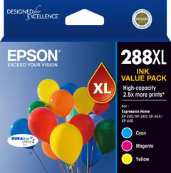 Pack contains: 3 x 288XL High Capacity DURABrite Ultra Individual ink cartridges (Cyan, Magenta, Yellow).
