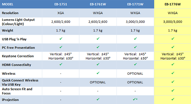 Its ultra-slim design, radiant widescreen performance and easy wireless connectivity make the Epson EB-1776W the ultimate choice in portable projectors. It delivers value, convenience and performance. The EB-1776W easily delivers HD video content or images from your widescreen notebook with native WXGA (1280 x 800) resolution. Couple that with 3000 lumens colour / white light output and the results are truly amazing.