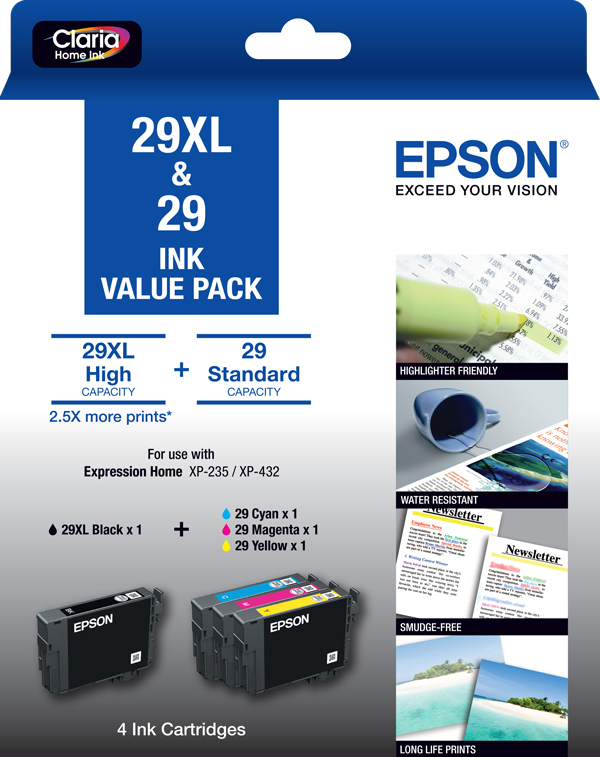 Pack contains: 29XL Black ink cartridge + 3 x 29 Std colours ink cartridges - Cyan, Magenta, Yellow.